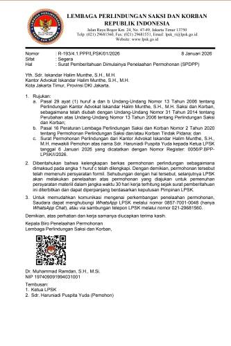 Dalam surat yang ditandatangani oleh Kepala Biro Penelaahan Permohonan, Dr. Muhammad Ramdan, S.H., M.Si., ditegaskan bahwa seluruh syarat formil telah “dilahap” habis dan dinyatakan lengkap. Kini, LPSK memasuki fase penelaahan materiil—sebuah fase krusial di mana kebenaran akan dikuliti habis selama 30 hari kerja ke depan.