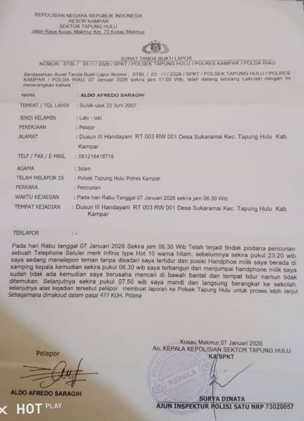 Berantas.co.id, Kampar, Riau — Polisi lakukan olah TKP sebagai langkah awal membongkar teror pencurian yang selama ini menghantui warga Tapung Hulu. Keseriusan Polsek Tapung Hulu dalam mengungkap dugaan tindak pidana pencurian satu unit Android milik Aldo Afredo Saragih, anak Wakil Ketua Umum DPP Solidaritas Wartawan Indonesia (SWI) Pajar Saragih, kini mulai terlihat nyata di lapangan.